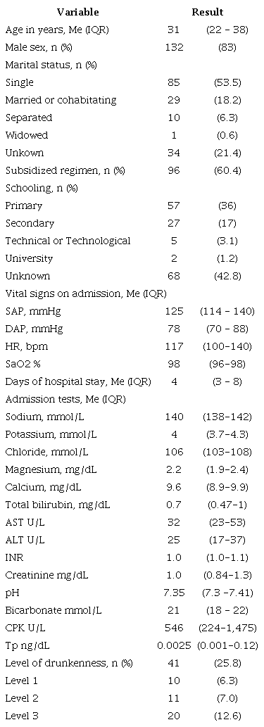 Sociodemographic (age, sex, marital status, educational level and health insurance regimen) and clinical (vital signs) characteristics were collected, along with admis sion lab tests (electrolytes, arterial gases, liver and kidney function, creatine phosphokinase -CPK-, troponin, blood alcohol level and urine toxins) and maximum peaks (high est recorded values of the variables) of transaminases, cre atinine (Cr) and CPK. Blood alcohol levels were classified according to the Colombian National Institute of Forensic Medicine 18, the laboratory reference value (30-200 U/L) was used for CPK values, and rhabdomyolisis was defined as levels greater than 1,000 U/L 19.