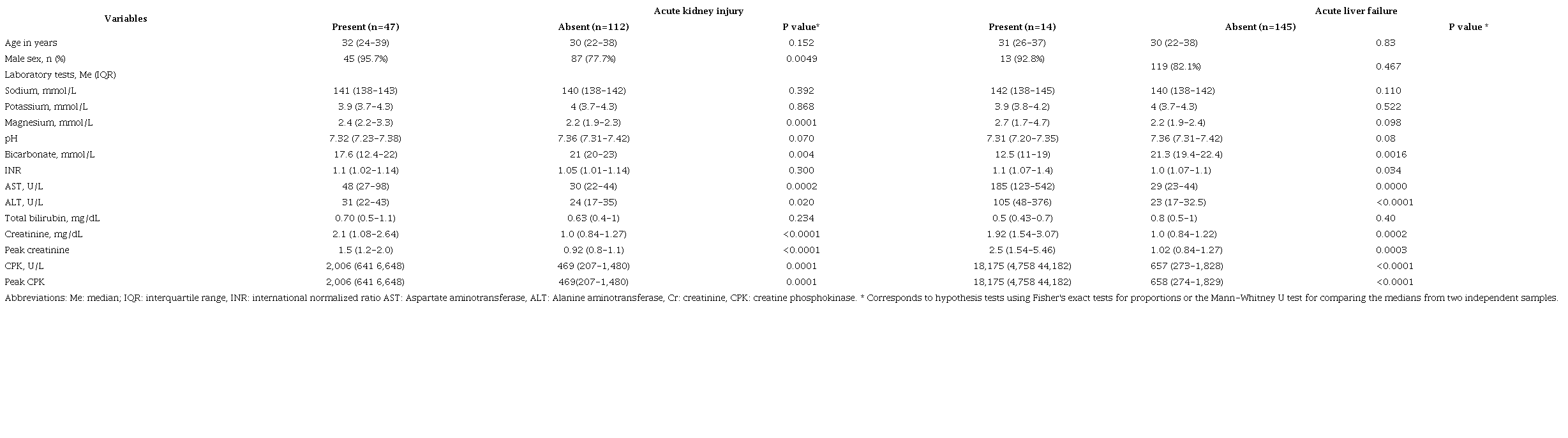 se incluyeron 159 pacientes, en su mayoría hombres, con bajo nivel educativo y mediana de edad de 31 años. La mortalidad fue 3.8%. La prevalencia de lesión renal aguda (LRA) fue de 29.6% (IC95% 22.6-37.3%), 8.8% (IC95% 4.3-14.3%) para insuficiencia hepática aguda (IHA), 4.4% (IC95% 1.8-8.9%) para infarto agudo de miocardio (IAM) y 4.4% (IC 95% 1.8-8.9%) para ataque cerebrovascular (ACV). Los niveles elevados de fosfocreatinquinasa (CPK) fueron encontrados con valores mayor a mil en 80% de pacientes con LRA, 100% de IHA, y en 50% de ACV.
