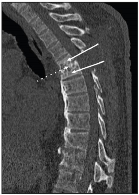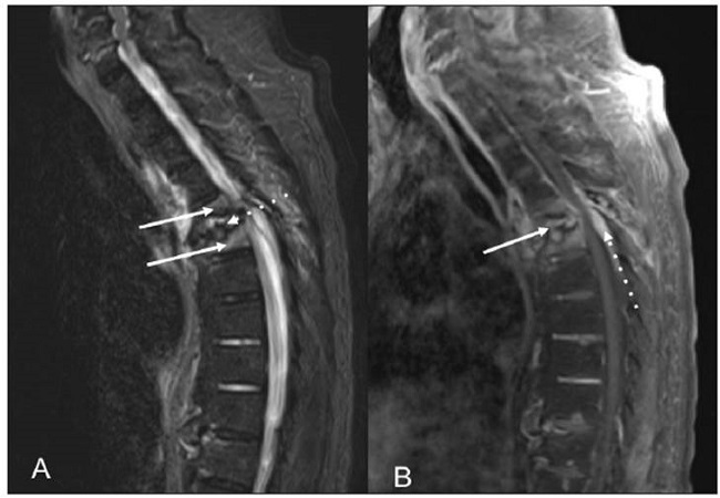 A 70-year-old man with a six-year history of diabetic nephropathy and ESRD, on hemodialysis, consulted with a complaint of two weeks of intense thoracic back pain with lower limb paresthesias and inability to walk. The physical exam showed a patient with paraplegia and intense pain on palpation of the T5 and T6 vertebrae. Initially, infec tious spondylodiscitis was suspected. The laboratory tests reported a creatinine level of 6.39 mg/dL, CRP 0.43 mg/dL, Hgb 10.8 gr/L, leukocytes 7,500, platelets 152,000, ESR 23 and negative blood cultures. The spinal x-ray showed a collapsed T5 vertebral body with anterior wedging and more than 50% loss of height, as well as loss of the T5-T6 intervertebral space (Figure 1). The computed tomography described T5-T6 as having marked irregularity and sclerosis of the intervertebral space, with end plate destruction. The resonance showed diffuse abnormalities in the intensity of the vertebral bodies, with hypointensity on STIR, loss of height and marked irregularity of the end plates and the T5-T6 disc, vertebral body edema, and retropulsion of the posterior wall towards the spinal canal which resulted in a narrowed, 3.5 mm canal with spinal cord compres sion (Figures 2 and 3). He underwent surgery in which a T5-T6 lesion was found, and paravertebral dissection to the laminae and transverse apophyses, along with T5 and T6 laminectomy, was performed. The spinal column was stabilized, and several samples were taken for culture and pathology. Antibiotics (piperacillin, tazobactam and vancomycin) were begun and then discontinued as all the surgical sample cultures (bone and disc) were negative. The histopathological study reported fragments of bone, cartilaginous and fibroconnective tissues with degenerative changes, chronic inflammation and reactive changes. Congo red and crystal violet staining was negative for amyloid. Infection or malignancy were ruled out and a metabolic bone disorder study was begun. Laboratory tests showed severe hyperparathyroidism (PTH 1,291 pg/mL), hyperphosphatemia (phosphorus 12 mg/dL), hypercalce mia (calcium 10.7 mg/dL), and elevated B2 microglobulin (18.3 mg/L), results which supported the diagnosis of DS secondary to hyperparathyroidism. Therefore, he underwent parathyroidectomy (3/4 of the parathyroid) with satisfactory results. The pathology report showed markedly hyperplastic parathyroid tissue. On his last assessment, his calcium-phosphorus profile had normalized, and he had paraplegia and chronic pain as sequelae, with no other complications.