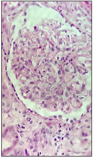 Three months later, rheumatology requested a repeat nephrology evaluation, with the following findings on the follow up tests: elevated creatinine at 2.01 mg/dL, with normal calcium and phosphorus, and low PTH. Anti-HIV, hepatitis B and hepatitis C antibodies were negative, C3 and C4 were not consumed, and protein electrophoresis did not have a monoclonal peak. Renal ultrasound reported mildly shrunken kidneys (explainable due to her age) with no corticomedullary differentiation disorders, and a normal renal artery Doppler. Since the source of the renal impairment was unclear, a percutaneous kidney biopsy was ordered.