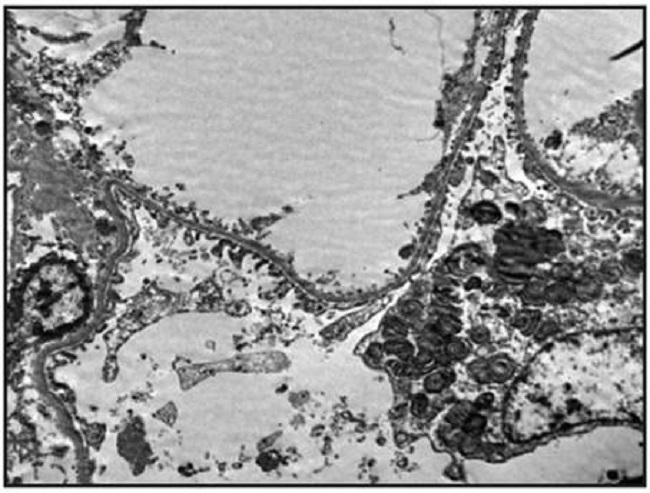 The biopsy report stated that 20 glomeruli were obtained; there was global sclerosis in five, with no mesangial or glomerular basement membrane abnormalities nor inflammatory changes in the glomeruli (Figures 1 and 2). There was 5% tubular atrophy, with no interstitial inflammation, myointimal thickening of the blood vessels and hyaline changes of the muscular wall with slight narrowing of the lumen (compatible with hypertensive nephrosclerosis). Immunofluorescence was negative for immune complex, complement (C3, C4, C1q), fibrin and light-chain immunoglobulin deposition. The main findings of electron microscopy or ultrastructural analysis were in the podocytes, with a loss of pedicels (their feet) in 70% of the capillary surface, and numerous zebra or lamellar bodies corresponding to lysosomal inclusions within them (Figures 3 and 4).