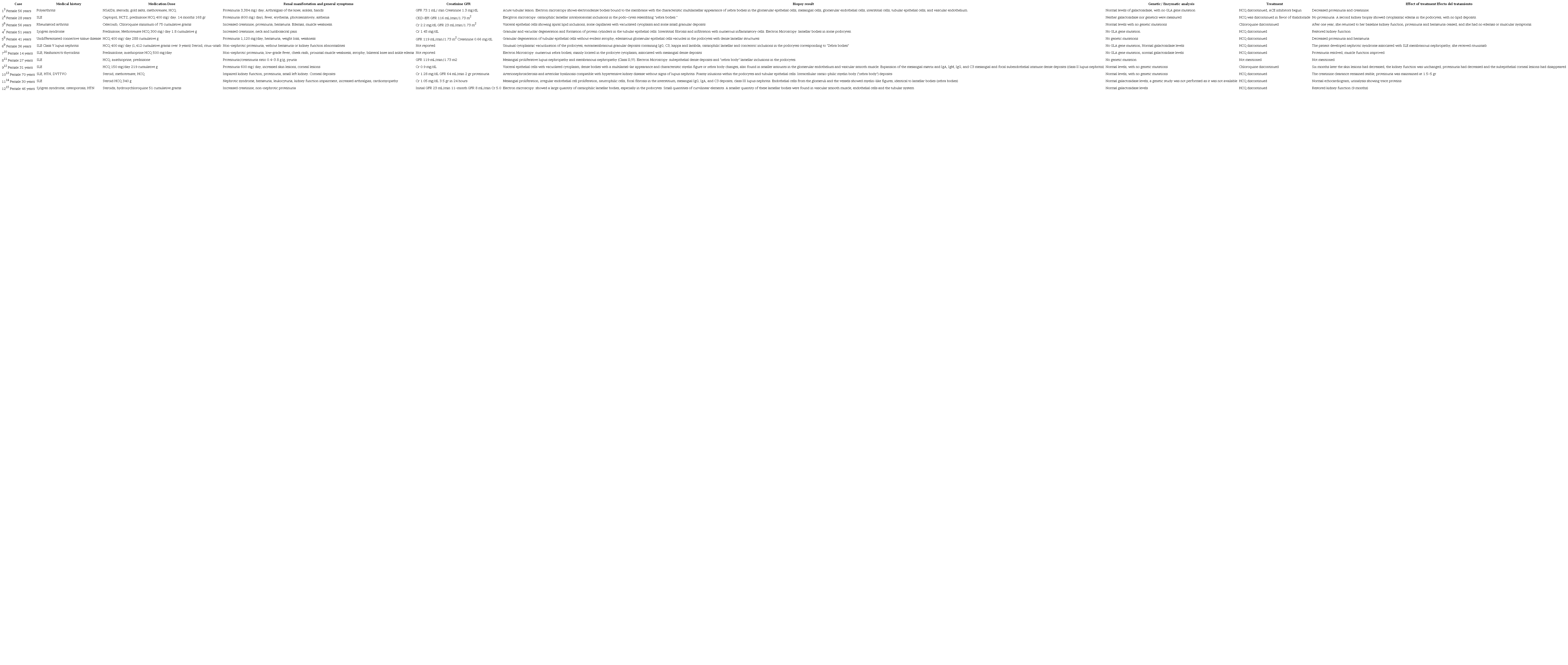 Drug-induced phospholipidosis due to antimalarial medications like chloroquine or hydroxychloroquine (HCQ) has been rarely described, always in the context of autoimmune diseases like Sjögren syndrome, systemic lupus erythematosus (SLE), RA and connective tissue disease, rather than in malaria treatment, possibly due its short treatment course in which the cumulative dose is small. To date, 12 cases of chloroquine and HCQ-induced phospholipidosis have been reported (Table 1), as well as one case in a renal transplant patient with underlying SLE, in whom graft rejection was suspected due to kidney function impairment, but phospholipidosis was found on the kidney biopsy, requiring hydroxychloroquine withdrawal, with resulting improvement 3-4,6-16.