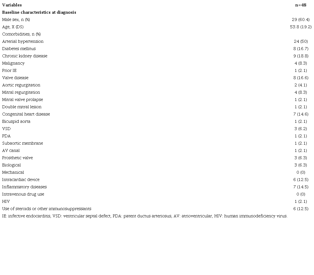 Numerous studies have evaluated the clinical, micro biological and echocardiographic characteristics of IE in the Western world. However, little is known regarding the epidemiology of IE in our setting, its echocardiographic characteristics, the main microbiological agents involved, the most common clinical manifestations and the complications in our patients. The local behavior of this entity must be observed in order to determine if there is a difference in the clinical profile which could serve as a basis for developing future management strategies.