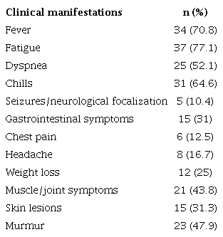 Fever and fatigue were the patients' most common clini cal manifestations (70.8 and 77.1%, respectively). A heart murmur was reported as a clinical finding in 47.9% of the patients (Table 2).
