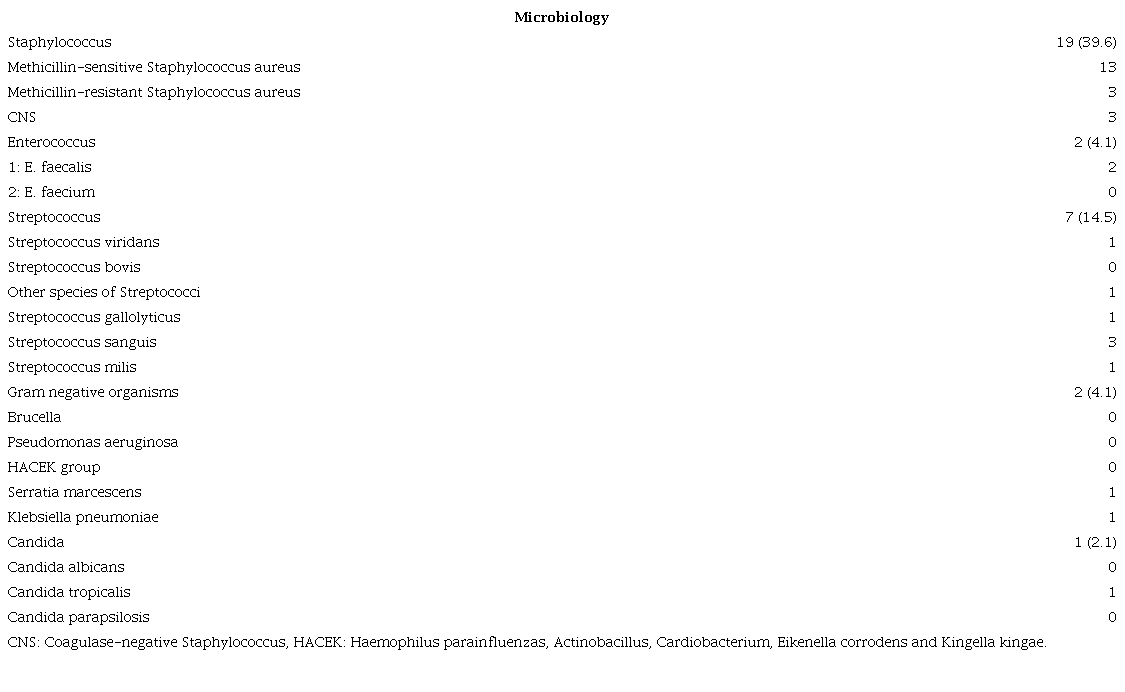 Thirty cases (62.5%) had positive blood cultures and 18 (37.5%) had negative blood cultures. Of the latter, one patient had a microbiological diagnosis with a valve tissue culture.