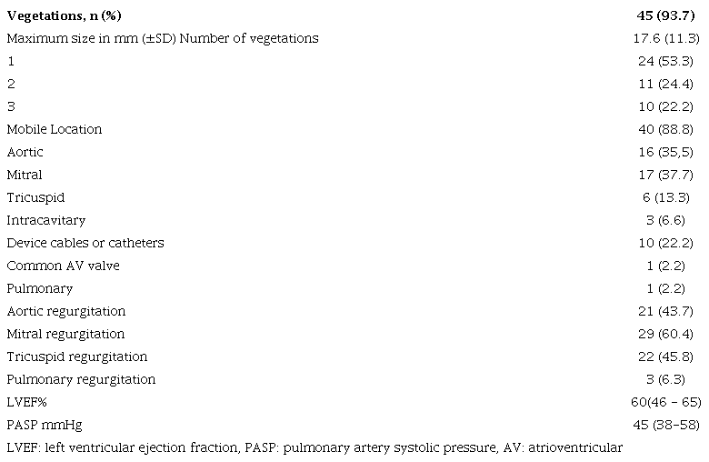 Of the 48 cases included, 46 patients (95.8%) were clas sified as definitive endocarditis and two patients (4.2%) as probable endocarditis according to the modified Duke criteria.