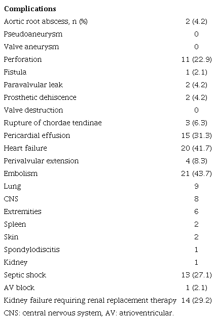 The initial diagnosis was made by transesophageal echocardiography in 26 patients (54.2%) and by transthoracic echocardiography in 22 (45.8%). The mean time between the clinical suspicion and the first echocardiogram was 24 hours (15-48 hours). Forty-one patients required only one echocardiogram for diagnosis, seven patients required two echocardiograms for diagnosis. The main echocardiographic findings are summarized in Table 4. Vegetations were found in 45 of the 48 patients (93.7%), most were mobile (40/45, 88.8%), and the mitral valve was the most frequent location (17/45, 37.7%), followed by the aortic valve (16/45, 35.5%). The average size of the vegetations was 17.6±11.3 mm. The most frequent complication was embolism in 21 patients (43.7%), followed by heart failure in 41.7%. The most com mon sites of embolism were the lung and central nervous system (CNS) (nine and eight cases, respectively) (Table 5).