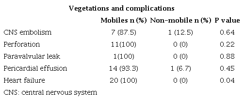 Patients with mobile vegetations tended to have more complications, although the relationship was not statisti cally significant, except for heart failure (p=0.04) (Table 6). Out of eight patients with CNS emboli, seven (87.5%) had mobile vegetations, and only one patient had non-mobile vegetations. Out of nine patients with pulmonary emboli, eight (88.8%) had mobile vegetations and only one had non-mobile vegetations. One hundred percent of patients with valve perforation as a complication had mobile vegetations.