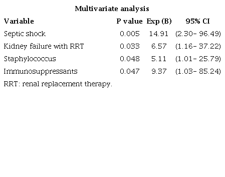 Using multivariate analysis, a significant association was found between mortality as an outcome and septic shock, kidney failure, Staphylococcus infection and the use of im munosuppressants. No association was found with the other variables analyzed (Table 7).