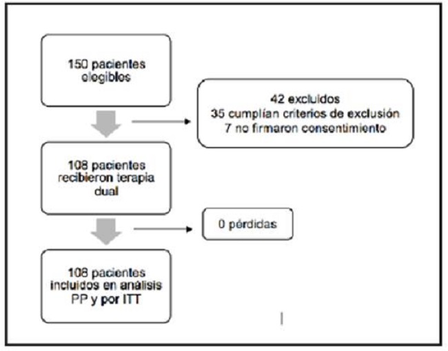 Material y métodos estudio cuasiexperimental realizado entre diciembre de 2019 y julio de 2020 en mayores de 18 años, con H.pylori identificado histológicamente. Todos recibieron esomeprazol 40 mg media hora antes de desayuno, almuerzo y cena mas amoxicilina 1 gramo oral cada 8 horas por 14 días. La erradicación se determinó con antígenos fecales (OnSiteTMH. pylori Biotech Inc) después de cuatro semanas del tratamiento. Resultados se incluyeron 108 pacientes, con edad promedio de 67 años, 70% mujeres. La erradicación por protocolo (PP) e intención de tratar (ITT) fue de 86% (IC95% 79.4-92.5%) para ambos. En los pacientes con tratamiento previo (26%) la eficacia fue de 85.7% (IC95% 71.8-99.5%). Los eventos adversos fueron leves en 31%, especialmente náuseas (16%) y distensión abdominal (14%). En ninguno se suspendió el tratamiento. Conclusión la terapia dual es eficaz, fácil de administrar y con pocos efectos adversos. Sería una buena opción en nuestro medio como terapia inicial y como rescate. Se requieren estudios más grandes para verificar nuestros resultados. (Acta Med Colomb 2021; 46. DOI:https://doi.org/10.36104/amc.2021.2091).