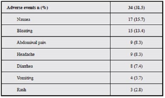 The H. pylori eradication rate was 86% (93/108; 95%CI 79.4-92.5%) for both ITT and BP (Table 2). Fourteen percent of the patients experienced treatment failure, of whom 60% were overweight and 14% were obese. Fifty-six percent of the patients had not received prior treatment and 26% (28/108) had received some treatment regimen. In patients with prior treatment, H. pylori was eradicated in 85.7% (24/28; 95%CI 71.8 - 99.5%) (Table 3). Adverse events occurred in 31% of the patients, with the most frequent being nausea (16%) and abdominal distention (14%). There were no serious adverse events or events which forced treatment suspension (Tables 2 and 4).