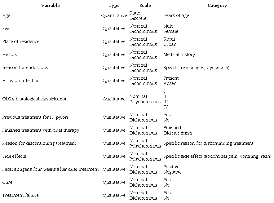 All patients underwent a routine EGD, with a minimum of eight hours of fasting. All had the procedure done under sedation (propofol and remifentanil) administered by an anesthesiologist. Biopsies of the body and antrum were taken during the procedure, following the Sydney protocol 32. Briefly, two biopsies were taken from the body, two biopsies from the antrum and one biopsy from the incisura, which were sent in separate, appropriately marked jars, in which, besides determining the presence of H. pylori, the severity of the chronic gastritis was stratified using the Operative Link on Gastritis Assessment (OLGA) system 33. Once the biopsies were taken, they were fixed in 10% formalin and sent to pathology. The pathology assessment followed the standard process of embedding them in paraffin, and multiple five-micron sections were obtained from each sample, which were stained with hematoxylin and eosin (HE). If H. pylori was not found, the samples were studied further with Giemsa staining 34. The demographic variables, comorbidities, endoscopic findings and treatment efficacy were recorded in a data collection tool designed for this study.