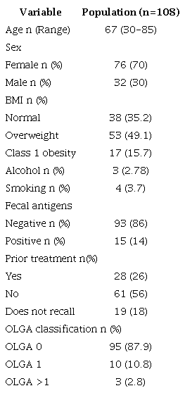 A total of 108 patients met the inclusion criteria, with an average age of 67 years; 70% were women. There were no losses to follow up (Figure 1). Forty-nine percent were overweight (defined by body mass index) and 16% had class I obesity. Endoscopic findings were as follows: chronic gastritis 100%, erosive esophagitis 33%, erosive duodenitis 14%, and gastric ulcer 4%. The OLGA results were: OLGA 0/IV 88%, OLGA I/IV 10%, and OLGA II/IV 2%. No patients had OLGA IV (Table 2).