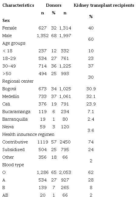 A total of 3,311 kidney transplant patients were studied, 60% of whom were males with a median age of 43 years, a minimum of one year and a maximum of 77 years. The highest percentage of transplants (25.8%) occurred during 2010. Thirty-two percent of the transplant patients belonged to regional center 2, with administrative headquarters in Medellín. Seventy-four percent were affiliated with the contributive health insurance regimen and 62% had type O blood.