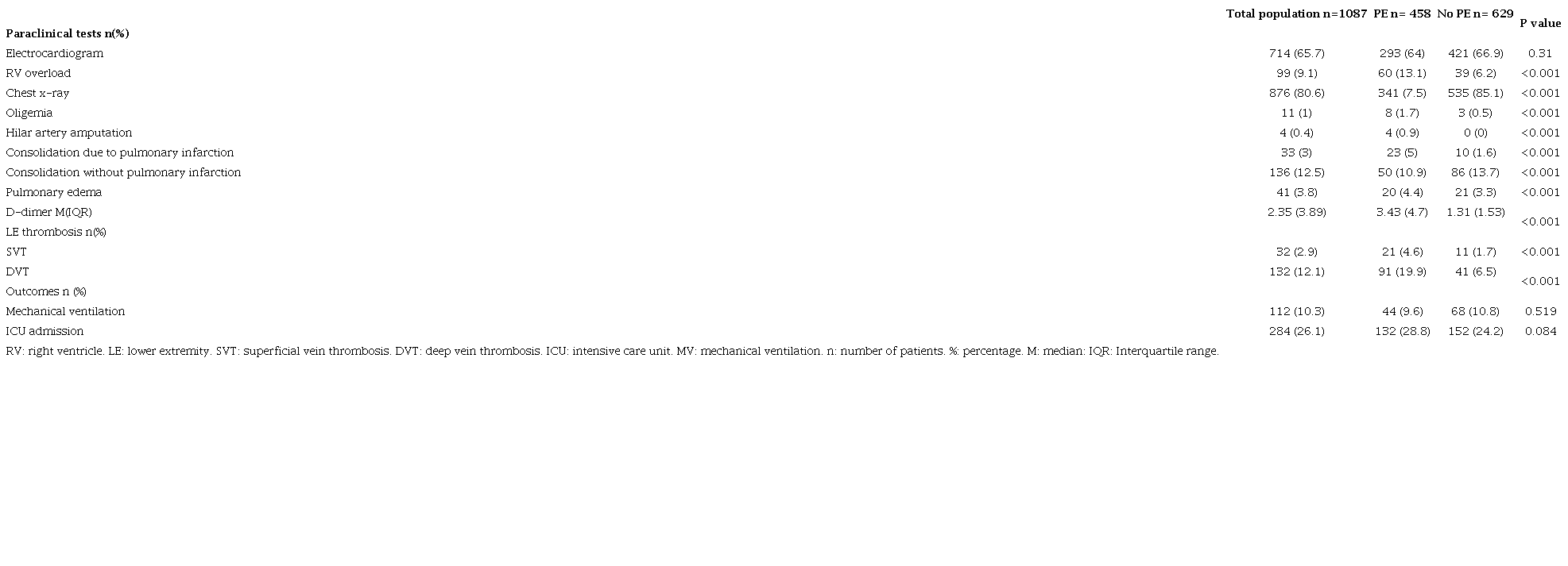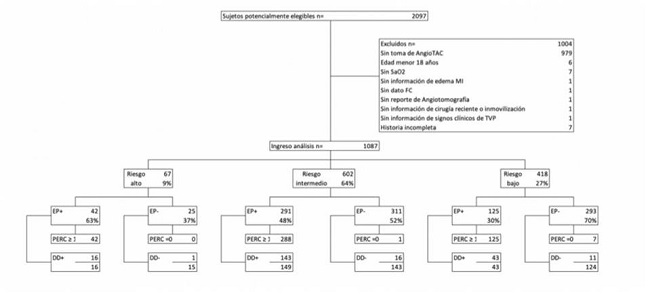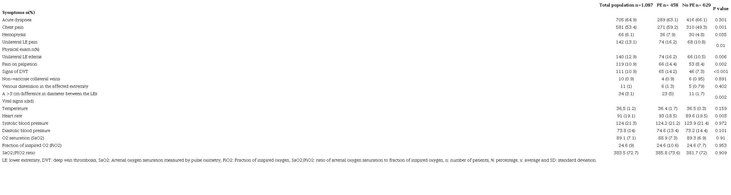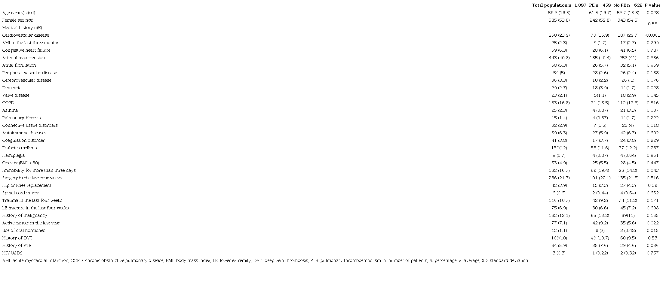 A total of 1,087 patients were included in the final analysis. Figure 1 shows the flowchart for patient inclusion in the study. Pulmonary embolism was found in 42% of the subjects evaluated. Table 1 shows the sociodemographic characteristics and PE related medical history of the population, where a statistically significant relationship was found between PE and dementia (p=0.027), active cancer in the last year (p=0.022), a history of PTE (p=0.035) and the use of oral contraceptives in women (p=0.016). Table 2 presents the clinical characteristics and physical exam findings with PE; a statistically significant relationship was found between PE and chest pain (p=0.001), hemoptysis (p=0.035) and unilateral lower extremity pain (p=0.010), together with a statistically significant relationship with signs of DVT excluding venous distention and non-varicose collateral veins. The vital signs analysis only found a statistically significant relationship between PE and heart rate (p=0.003).