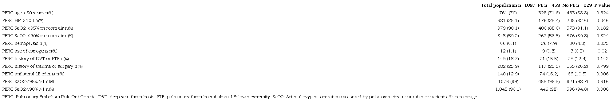 Other variables which may affect saturation levels are age and the presence of comorbidities; our population had an average age 12 years greater than Kline et al.'s study 12 in which the original PERC validations were performed. However, this variation in age in different populations 12,13,22 does not seem to significantly affect the score's performance. Regarding comorbidities, there was a greater proportion of subjects in our study with a history of pulmonary disease, compared with other PERC validation studies 12. However, the proportion of subjects with chronic obstructive pulmonary disease in our population was similarly distributed between subjects with and without PE, and subjects with asthma and pulmonary fibrosis made up only 5%, which we believe is unlikely to have influenced the results obtained regarding PERC's discriminatory power using an SaO2<90%. On the other hand, dementia was found to be related to PE, which could be explained by decreased mobility and the presence of comorbidities in these patients. This condition, which has not been reported much in previous studies, has been related to greater severity and increased mortality in patients with PE 30.