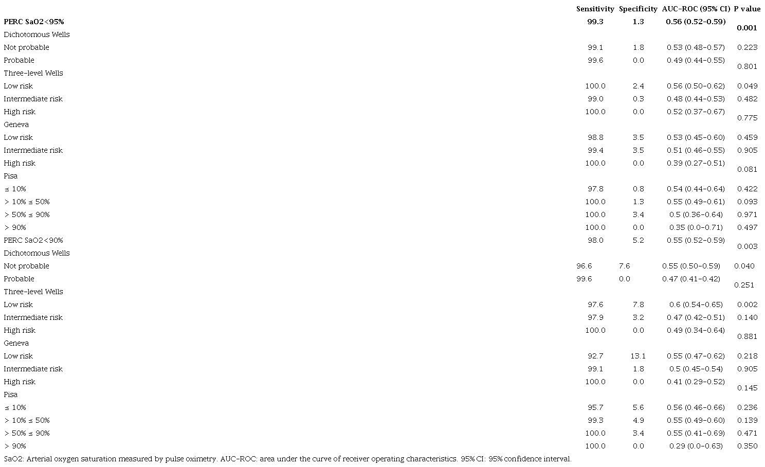 Table 4 shows the results according to the different variables used to calculate the PERC score and their relationship with PE. It also shows the relationship between PE and the PERC score calculated using SaO2<95% and SaO2<90% and the diagnosis of PE, where a PERC >1 calculated with an SaO2<90% was statistically significantly related to PE (p=0.006). Table 5 shows the sensitivity, specificity and AUC-ROC results of the PERC score calculated using SaO2<95% and SaO2<90% in patients classified in the different risk groups according to the Wells, Geneva and Pisa scores. The PERC score using SaO2<95% was found to have a sensitivity of 99.3%, specificity of 1.3%, false negatives of 0% and an AUC-ROC of 0.56 (95% CI:0.52-0.59) (P=0.001), while the PERC score calculated with SaO2<90% had a sensitivity of 98.0%, specificity of 5.2%, false negatives of 2.4% and an AUC-ROC of 0.60 (95% CI:0.54-0.66) (p=0.002).
