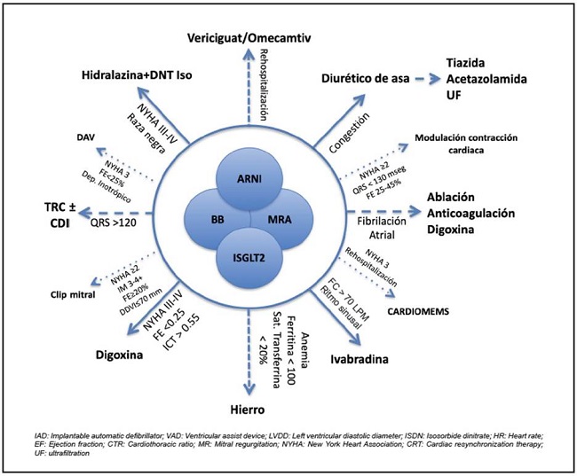 Introduction heart failure with reduced ejection fraction has a growing therapeutic arsenal. Thus, the indications for each therapy must be refined. Methods a systematic review was performed following the Preferred Reporting Items for Systematic Reviews and Meta-Analysis (PRISMA) guidelines, to update the systematic search performed in the development of the "Clinical Practice Guidelines for Prevention, Diagnosis, Treatment and Rehabilitation" (CPG) of the Colombian Ministry of Health. Results six new clinical trials were found which substantially modify the main recommendations of the CPG. Angiotensin receptor antagonists combined with neprilysin inhibitors (ARNI), sodium-glucose cotransporter 2 (SGLT2) inhibitors, betablockers and mineralocorticoid receptor antagonists (MRA) are now the main core of treatment for patients with heart failure with reduced ejection fraction. Other therapeutic options should be considered after beginning and titrating the doses of these four medications. Discussion given the robustness of the evaluating studies, the proposed practical scheme, as the central core with four fundamental therapeutic strategies, will improve the treatment of patients with heart failure and allow the stepwise inclusion of other alternatives, plotted as orbits, to impact on other individual outcomes. (Acta Med Colomb 2021; 46. DOI: https://doi.org/10.36104/amc.2021.2108).