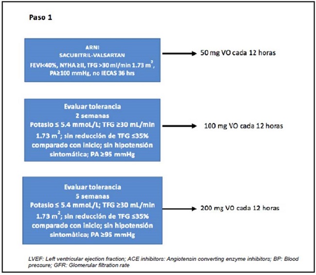 The PIONEER HF trial 49 proved the safety of beginning this drug in uncompensated HF in patients with LVEF <40%, BNP ≥400 ng/L or NT-proBNP ≥1,600 ng/L, no inotrope requirement in the last 24 hours, nor use of vasodilators, SAP <100 mmHg or increased diuretics in the last six hours. Sacubitril/valsartan showed superiority at a dose of 200 mg every 12 hours compared with enalapril at doses of 10 mg every 12 hours, with regard to decreased NT-ProBNP levels and a reduction in 30-day readmissions as a secondary outcome.