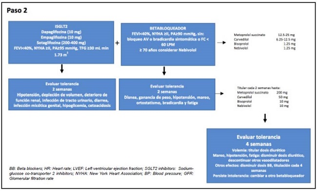 It is important to highlight that the algorithm is conceived in order to begin these treatments, considered to be pillars, early; and that the suggested titration may be modified according to the patient's clinical condition, although it is expected that the use of these recommendations will improve tolerance and adherence, in general, and that low doses of all the groups may be prescribed, to be subsequently increased according to the set sequence of steps 131.
