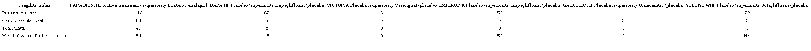 The fragility index shows robust results for sacubitril/ valsartan for both the primary combined outcome as well as for cardiovascular death, death from a cardiovascular source and hospitalization for HF. For dapagliflozin, the results are robust for the primary combined outcome and hospitalization for HF. The empagliflozin study showed robust results for the primary combined outcome and hospitalization for HF; for sotagliflozin it is robust for the primary outcome; and vericiguat and omecamtiv mecarbil had very low fragility indices, especially the latter one (Table 2).