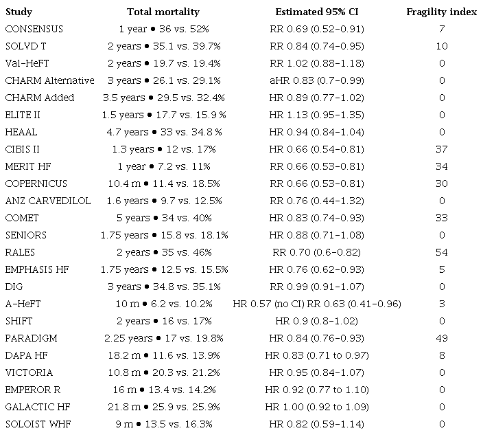 A comparative analysis of the classic and new studies was performed for the outcome of mortality (Table 3). The results showed estimates below 1 in almost all cases, except for valsartan, losartan and omecamtiv mecarbil. Those with a 95% CI above 1 were valsartan and candesartan in the CHARM Added trial, losartan in ELITE II and HEAAL, carvedilol in ANZ, nebivolol, digoxin, ivabradine vericiguat, empagliflozin, omecamtiv mecarbil and sotagliflozin. The fragility indices were robust for beta blockers, spironolactone and sacubitril/valsartan.