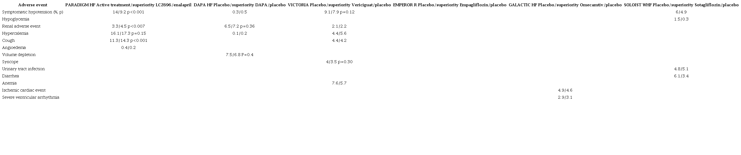 The VICTORIA study involved 5,050 patients with high-risk HF-rLVEF (40% in NYHA functional class III), severe impairment of systolic ventricular function (mean LVEF of 29%), with elevated natriuretic peptides and recent decompensation (80% within the last three months) to receive oral vericiguat with a target dose of 10 mg per day, compared with placebo plus guideline-directed treatment. The study showed a modest reduction in the primary outcome of cardiovascular death or first hospitalization for HF (35.5% vs. 38.5%, HR 0.9 [95% CI, 0.82-0.98, p=0.02]), derived mainly from the effect on hospitalizations for HF or any cause, with no impact on cardiovascular deaths or total deaths. Mean follow up was 10.8 months. Due to its vasodilating properties, there was symptomatic hypotension in 9.1% of the patients compared with 7.9% in the placebo group (p=0.12) and syncope in 4% compared with 3.5% in the placebo group (p=0.30) 72.