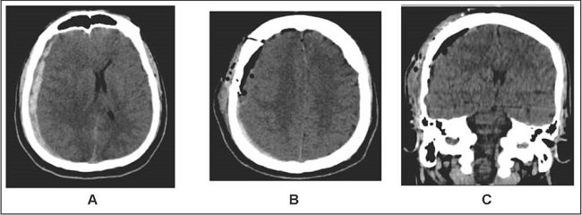 A 32-year-old male patient with a history of neurofibromatosis and spastic quadriparesis was admitted to a tertiary care hospital in the city of Pereira, Risaralda, for the scheduled resection of a left intradural extramedullary tumor, possibly a neurofibroma, at L5. A laminectomy and foraminotomy were performed to remove the tumor, with no evident complications during the procedure, and therefore the patient was transferred to the recovery room where he was extubated as scheduled. After approximately two hours, the patient began to show a marked deterioration in his level of consciousness, Glasgow 4/15, along with right anisocoria. A simple computerized axial tomography of the head showed an acute subdural hematoma in the right hemisphere, with a midline shift and signs of uncal herniation (Figure 1). He was once again taken to surgery for subdural hematoma drainage by craniotomy, and meningeal vessel occlusion. He was transferred to the intensive care unit immediately after surgery and there experienced a tonic-clonic seizure of the right side of the body, requiring benzodiazepine treatment. A follow up simple CAT of the head showed post-surgical changes (Figure 1). During his stay in the ICU he had a torpid clinical course and progressive deterioration of oxygenation levels with adult acute respiratory distress syndrome (ARDS), requiring neuromuscular relaxation and protective ventilation. After 12 days in the hospital, the patient died.