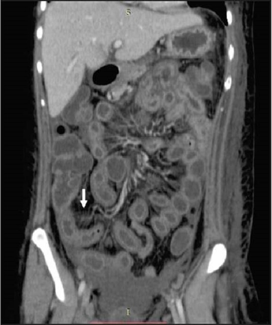 This was a 34-year-old patient with a history of systemic lupus erythematosus diagnosed in 2008, at which time he had hemolytic anemia, arthritis and serositis. Since then, the patient had been in remission, taking only 5 mg of prednisone and 1 mg of folic acid, both once a day. He went to the emergency room for intense abdominal pain along with vomiting and diarrhea. As part of the diagnostic workup, he underwent abdominal tomography with contrast, which is the gold standard for diagnosing lupus enteritis. The tomography showed thickening and abnormal contrast of the vascular wall throughout the intestine (halo sign), an increased number of visible abdominal vessels (comb sign), ascites and pleural effusion. After ruling out other etiologies, methylprednisone pulses were begun with noticeable improvement of the clinical symptoms within six hours.