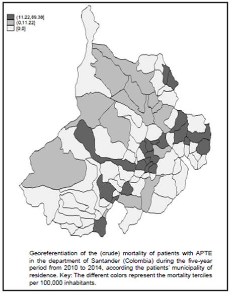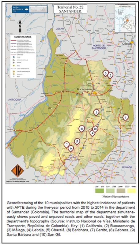 A review of the geographical location of the cases showed a tendency for cases to increase with increased altitude (meters above sea level [MASL]) of the case's place of residence. Therefore, the correlation between altitude and the incidence of APTE was evaluated, finding that the incidence of APTE increased by 4.1 per 100,000 inhab. for every 100 meters increase in altitude (p= 0.01; 95% CI 1.90-6.33). The incidence of APTE was inversely related to the time required to reach the reference city, such that for every minute more required to access the reference site, the incidence of APTE decreased by 0.4 cases per 100,000 inhab. (p= 0.021; 95% CI -0.67-0.057). The APTE mortality was correlated with the altitude above sea level of the city of residence, finding that mortality increased by 1.0 per 100,000 inhab. for every 100 meters of increased altitude (p= 0.035; 95% CI 0.08-2.0). The land travel time from the residence sites to the reference city, which is the city of Bucaramanga, was also analyzed. The median was 60 minutes. When the cases resided more than 60 minutes away, APTE mortality increased by eight units (adjusted for age). It is worth noting that information on the number of institutions and days between the initial consult and admission to the final treatment institution was not available.