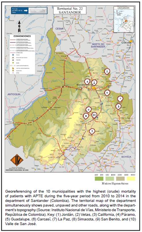 The APTE mortality rate was 8.03 deaths per 100,000 inhab. The attributable mortality could not be estimated due to insufficient data. Only 0.7% of the referrals were made through the Emergency Control Center. On another note, 79 patients (17.52%) had to be admitted to the intensive care unit. Figure 2b presents the mortality distribution by municipality in the department of Santander. Figure 3b shows the location of the 10 municipalities with the greatest mortality, with the peculiarity that they are found in the mountainous zone of the eastern mountain range and are spread out from the reference city, which is Bucaramanga.