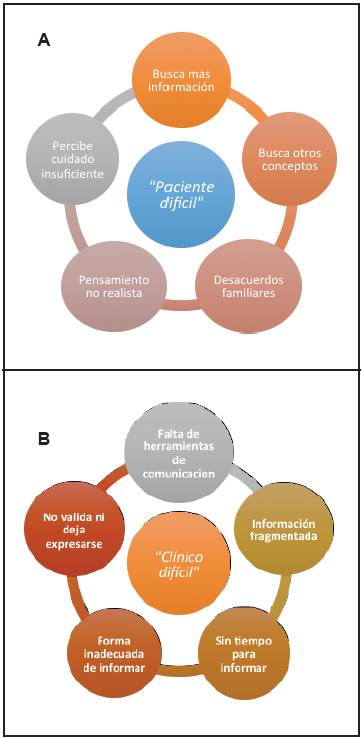 Likewise, we could speak of "difficult clinicians": those without training in communication skills; lacking empathy for their patients; who transmit fragmented information which is not consistent with the established plan of care; do not spend time clearly explaining the care process, progression and expectations of the disease and its treatment; are not aware of the patients' personal history, preferences and wishes; do not know how to provide information at the appropriate time and place; and, finally, do not validate the information received and do not allow emotions to be expressed (Figure 1B).