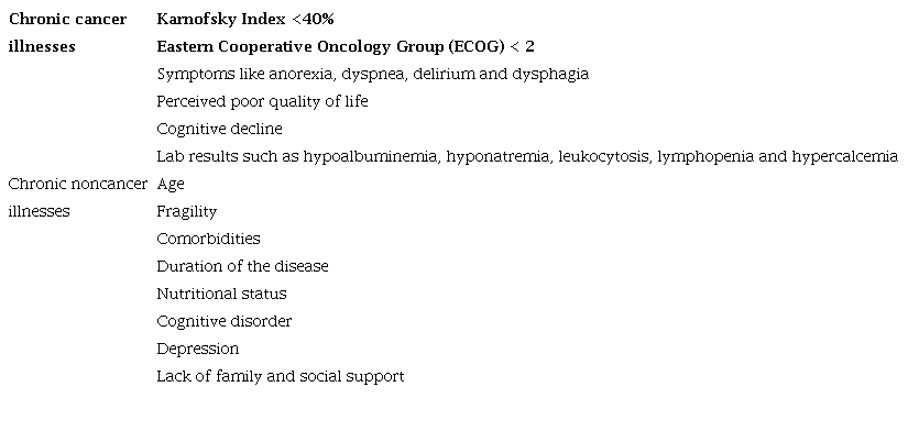 The prognosis should be determined based on elements such as the clinical estimate of survival based on the disease trajectory, the patient's functional status and the presence of symptoms which would mark a tipping point, such as dysphagia, dyspnea, anorexia or delirium 5. Specific biological parameters (hematological, hepatic, ventricular function or lung capacity) for each disease should be considered; these help evaluate the degree of organ dysfunction, which is related to survival. Finally, there are specific and nonspecific prognostic models for patients with chronic cancer and noncancer illnesses. These are based on the disease trajectory, functionality scales such as the Karnofsky or ECOG scales, prognostic indices and, in patients with noncancer chronic illnesses, specific scales with organ dysfunction parameters (NYHA for heart failure, Child-Pugh for liver disease, BODE for chronic pulmonary disease and FAST for dementia). Nonspecific scales are also applied, such as nutritional status, functionality, pressure sores, cognitive decline and infections, which have an additional impact on the risk of death 7,9-11.