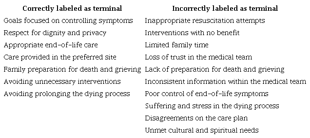 It is important to correctly identify a terminal state, as this affects the care plan in many aspects: focusing the treatment goals on adequate symptom control, maintaining dignity and privacy, conducting an appropriate communication process for each condition, strengthening the patient and family's participation in decision making, providing optimal care at the end of life and avoiding its unnecessary prolongation, implementing a timely transition of care to the preferred site, documenting the existence of advance directives, providing appropriate accompaniment, and preparing for death and grieving. Otherwise, the patient will be exposed to inappropriate interventions, valuable family time will be lost, and cultural and spiritual needs which are important in this stage will be excluded, preventing preparation for death and causing conflicts with the medical team in light of the outcomes (Table 2) 13.