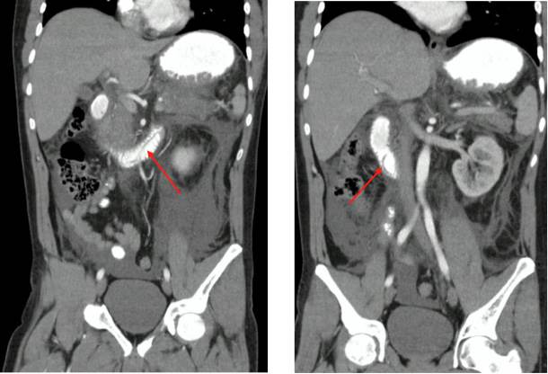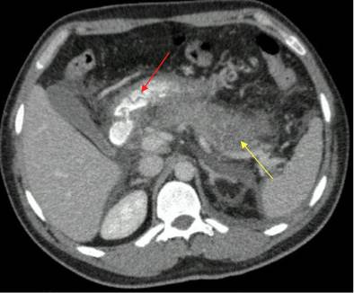 This was a 35-year-old male of low socioeconomic status with no other significant history. He was admitted to the emergency room for sudden onset severe epigastric pain. On exam, his vital signs were within normal limits, and he had no signs of peritoneal irritation. Acute coronary syndrome and hollow organ perforation were ruled out. Studies showed elevated bilirubin, transaminases, alkaline phosphatase and, especially, amylase. He was diagnosed with acute pancreatitis (AP) with no evidence of multiple organ dysfunction. His studies were completed with an upper abdominal ultrasound showing no cholelithiasis, with collections in both paracolic gut ters. A double-contrast computed tomography of the abdomen (ab dominal CT) was ordered, which showed acute pancreatitis (Figure 1) and a tubular filling defect towards the duodenal papilla (Figure 2). An upper gastrointes tinal endoscopy (EGD) showed a single 25 cm parasite located in the duodenal papilla. After antibiotic cover age and deworming, the patient developed walled-off necrotizing pancreatitis in the fifth week of follow up, requiring a necrosectomy and collection drainage.