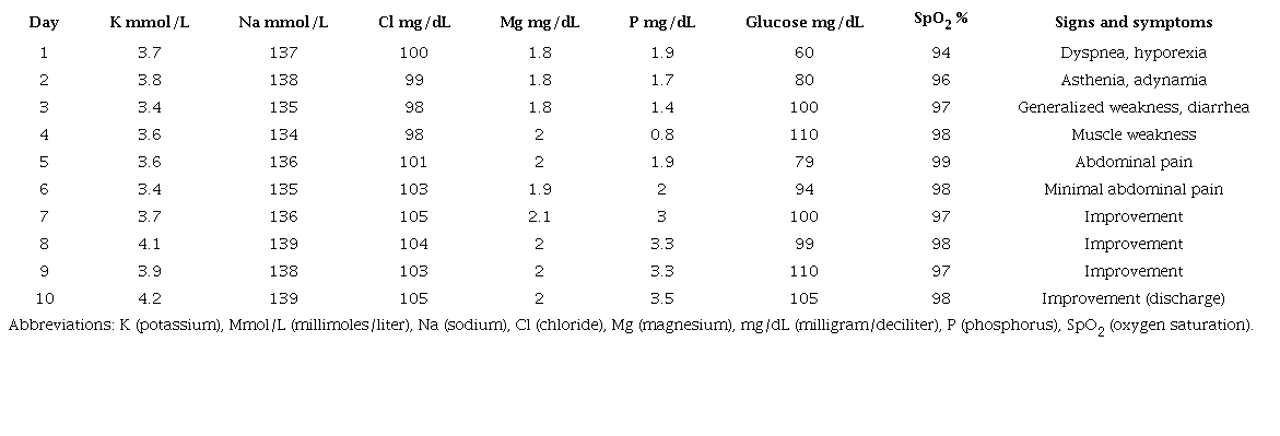 • Day 3: generalized weakness, refusing oral intake; a nasogastric tube was placed and enteral feeding begun. Subsequently, she started to have loose stools, with serum phosphate levels of 1.4 mg/dL. Electrolyte replacement was given, with improvement; however, she pulled out her tube on purpose because it was uncomfortable, and she self-induced vomiting (Table 1).