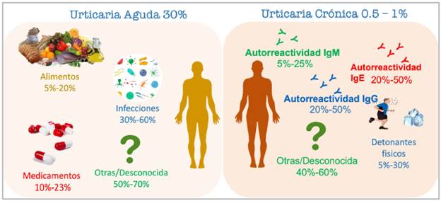 Urticaria is a disease which primarily affects the skin, causing welts and/or angioedema 1. Patients commonly refer to these lesions as "hives," "reddening," "nettle rash," and "swelling." Based on how long it lasts, it is divided into acute and chronic urticaria (less than or more than six weeks, respectively), although the lesions are clinically similar. Acute urticaria affects one out of three people at some point in their lives; it has multiple causes and tends to be self-limiting. Chronic urticaria affects approximately one out of 100 people 1,2. Despite being less frequent than acute urticaria, it has a greater impact on the patients' quality of life and that of their families. Between 40 and 70% of patients with chronic urticaria believe their disease is secondary to a food or medication and decide to implement restrictions, which in more than 95% of cases are unnecessary. These restrictions are often supported by their attending physicians, with no clear proof of causality, worsening their quality of life 3,4. For example, they may avoid the consumption of several foods or medications even when the events persist after discontinuing the suspected substance.