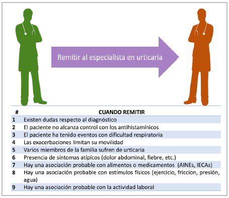 Often, patients with urticaria are referred to specialists even before confirming if they have acute or chronic urticaria, which makes it difficult to access appropriate treatment promptly. Similarly, referrals to the emergency room and the lack of follow up in primary care lead to impaired disease control.
