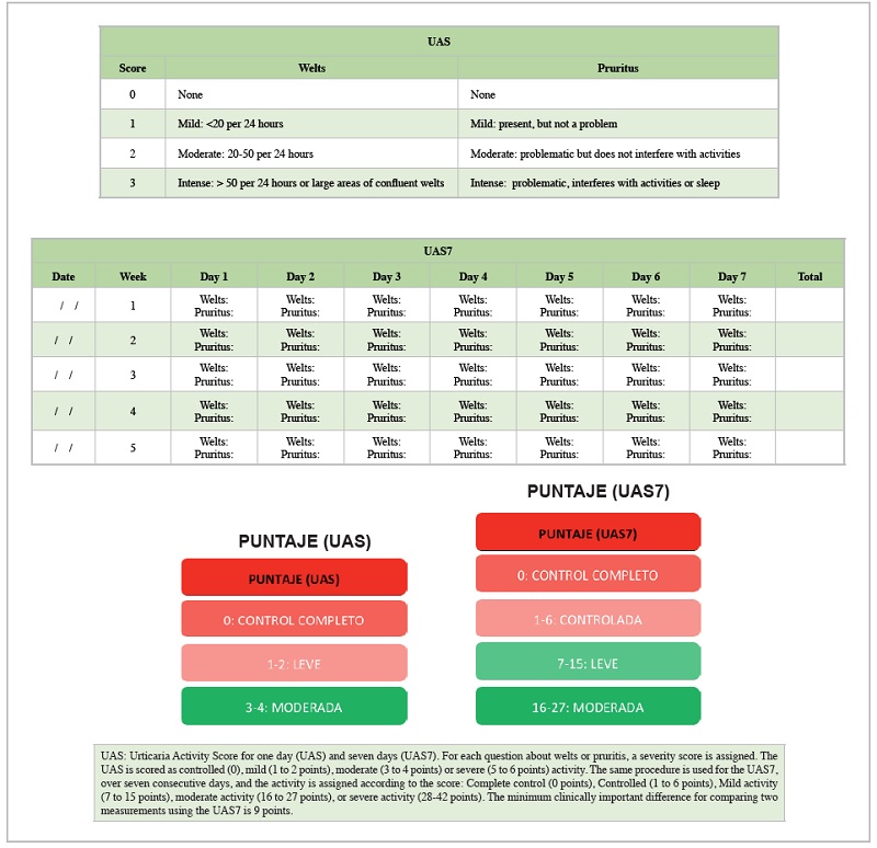 The score evaluates the number of welts (0-3 points) and intensity of the pruritis (0-3 points) in 24 hours and assigns a score from 0-6. This scale can be applied on the day of the appointment, but ideally the patient should use it for at least seven consecutive days prior to the office visit, as this allows changes over time to be evaluated; in one week of evaluation, the maximum score is 42 points (Table 3). Qualitatively, the results are divided according to disease activity into "complete control" (score of 0), "control" (1-6 points), "mild" (7-15 points), "moderate" (16-27 points), and "severe" (28-42 points). The minimum clinically important difference on the UAS7 is nine points. Various web pages (e.g., https://www.profesionalessanitarios.novartis.es/areas-terapeuticas/dermatologia/urticaria/recursos-medico/cuestionario-uct) and/or cell phone applications (e.g. UrticariApp) are available free of charge to calculate this score.