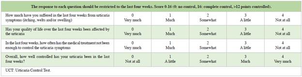 The UCT evaluates urticaria control according to the response to pharmacological treatment. This scale contains questions which determine if the disease is "controlled" (12 or more points) or "not controlled" (11 or fewer points) 16. The abbreviated UCT consists of four simple questions 17 with a maximum score of 16 points (Table 4). The minimum clinically important difference is three points. Lack of control on the UCT or on the UAS7 indicates a need for treatment adjustment, and this is why it is important to apply them at each office visit. Various web pages (e.g., https://www.profesionalessanitarios.novartis.es/areas-terapeuticas/dermatologia/urticaria/recursos-medico/cuestionario-uas) and/or cell phone applications (e.g. UrticariApp) are available free of charge to calculate this score.