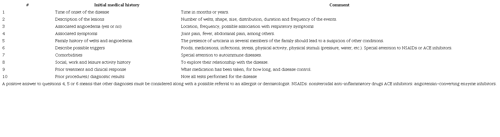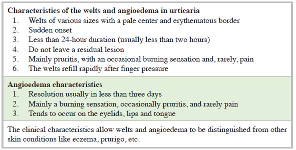 Since welts and angioedema are not pathognomonic of urticaria, the disease must be differentiated from other processes like anaphylaxis, hereditary angioedema, and urticarial vasculitis, among others. In this case, we can ask some questions aimed at ruling out differential diagnoses. In Tables 1 and 2 and Figure 1 we present the most common clinical characteristics of urticaria, and the main points to ask about and describe in the medical chart.