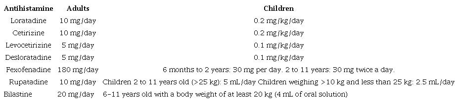 Management in children follows the same steps described above, adjusting the antihistamine dose according to age (Table 5). Only medications with proven efficacy and safety in the pediatric population should be used25-27. Cetirizine, desloratadine, fexofenadine, levocetirizine, rupatadine, bilastine and loratadine have been well studied in children over the age of two, and some real-life studies suggest that loratadine, cetirizine and fexofenadine can even be used in six-month-old children. For children under six months old, a case-by-case assessment should be performed to determine the need for antihistamines versus the risks.