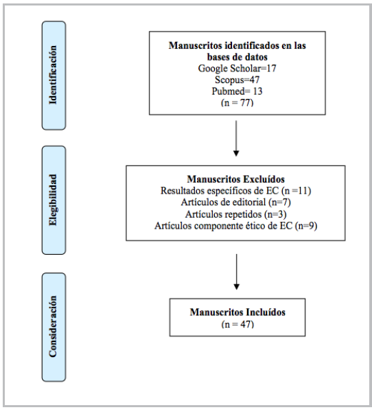 Material y métodos: Revisión de literatura que incluyó manuscritos publicados entre los años 2016-2020, artículos originales o de revisión que describieran aspectos metodológicos de los ensayos clínicos. La búsqueda y selección se realizó en Google Scholar, Scopus y Pubmed, obteniendo un total de 47 manuscritos para el análisis.