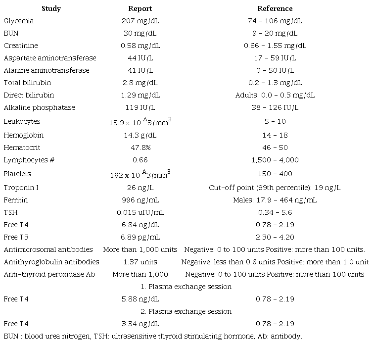 This was a 55-year-old patient with a 14-day history of weakness, fatigue and a dry cough, with COVID-19 infection confirmed by a positive PCR. His clinical condition worsened with more severe symptoms and a quantified fever. On admission to the emergency room he markedly worsened, with hypoxemic respiratory failure requiring invasive mechanical ventilatory support. His medical history was positive for type 2 diabetes mellitus being treated for one year with a basal insulin regimen. He was admitted to the ICU on ventilatory support with sedation, analgesia and deep neuromuscular relaxation, with acid-base balanced arterial gases and a severe oxygenation disorder (PaO2/FiO2: 76 mmHg), and no vasopressor support. He was pronated for 22 hours, with which his oxygenation increased significantly (PaO2/FiO2: 199 mmHg), with no need for further pronation cycles. During his ICU stay, he had high blood pressure along with tachycardia and documented febrile episodes, despite negative cultures. An ultrasensitive thyroid stimulating hormone (TSH) test was ordered, which was suppressed, with elevated free T4 (FT4). Therefore, the Burch and Wartofsky scale was applied, with a score of 45, diagnosing thyroid storm; treatment was begun with methimazole and metoprolol. Despite treatment, he continued to have high blood pressure, fever and tachycardia, so the methimazole dose was increased. Progressive reduction of sedation and analgesia was begun to evaluate the possibility of withdrawing invasive support, but the patient had episodes of psychomotor agitation, which limited the possibility of advancing with extubation. On the seventh day, he had a documented episode of atrial fibrillation with rapid ventricular response; the beta blocker and antithyroid medication dose was increased to the maximum level (60 mg/day of methimazole). He continued to have an unsatisfactory response, with persistent atrial fibrillation and arterial hypertension, and plasma exchange therapy was decided on. After the first session, the heart rate was controlled, with a sinus rhythm and adequate blood pressure control, improving the neurological symptoms. A new spontaneous breathing test was done, and extubation was accomplished with no complications. Given his good clinical progress, he was transferred to the regular floor and then discharged home. The most important laboratory tests are summarized in Table 1.