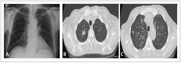 The chest x-ray shows interstitial opacities and mediastinal widening (Figure 1A); in immunocompromised patients, x-rays do not have good specificity or sensitivity for detecting respiratory diseases and differentiating among them. The chest HRCT shows random or diffuse micronodules (Figure 1C), although the centrilobular ones are most evident, associated with solid nodules, especially a spiculated one in the right upper lobe (Figure 1B). Micronodules with this distribution suggest hematogenous dissemination and generate a differential diagnosis of miliary tuberculosis, histoplasmosis and other fungal infections like candidiasis and disseminated blastomycosis; hematogenous metastasis of extrapulmonary tumors is also included, especially thy roid, melanoma, breast and kidney tumors 10.