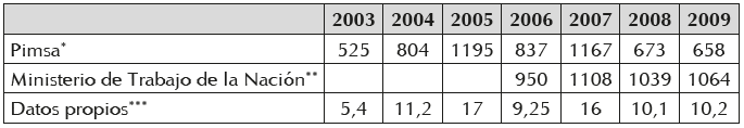 Sin embargo, para el periodo entre junio de 2003 y diciembre de 2009 la unidad de análisis es el paro. La razón -a pesar de lo afirmado- es la necesidad de acotar el universo de búsqueda debido a la restricción de recursos. En función de dichas restricciones también se limitó la fuente hemerográfica al diarioLa Nación. A pesar de estas limitaciones, la evolución del número de paros tiende a ser coincidente y consistente con otras mediciones con mayor cobertura de medios de prensa y mayor cantidad de casos, como puede observarse en elCuadro 1.