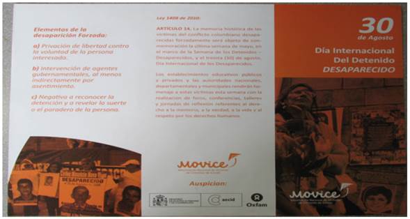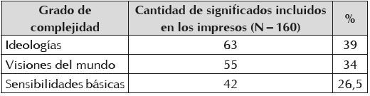 Al discriminar la información contenida en los 38 impresos recolectados, de acuerdo con el grado de complejidad de los significados que intervienen en la construcción de los símbolos condensadores, se encuentra que, tal como se aprecia en el Cuadro 3, la frecuencia que se presenta en el caso de los pendones se invierte y los significados más recurrentes son ahora los de mayor complejidad. Esto se debe a que los impresos ponen el énfasis en aclarar y profundizar los significados de la categoría ideologías, que son introducidos de manera superficial en los pendones mediante la descripción pormenorizada de las características de crímenes como la desaparición forzada, por ejemplo, tal como ocurre en el caso del impreso que aparece en la Fotografía 2.