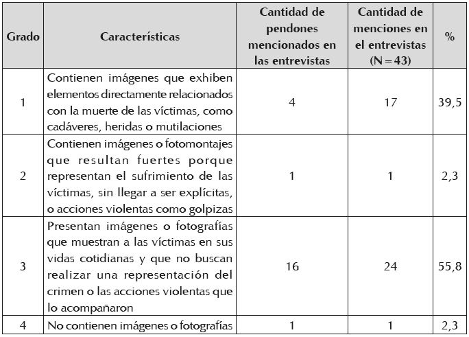 Es posible someter dicha hipótesis a prueba para el caso de los pendones que se exhiben durante las galerías de la memoria. Si se comparan los datos de los pendones clasificados en el grado 1 de la escala que aparece en el Cuadro 1 con el número de veces que fueron referenciados en las entrevistas cortas, se obtiene que tan solo 4 pendones, equivalentes al 4,7% (N=85), acaparan el 39,5% de las menciones: 17 de 43.