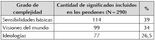 Los significados identificados en el análisis de la composición de los pendones son: a) sensibilidades básicas: la juventud de las víctimas, la familia destruida por la violencia, la crueldad de los victimarios, el sufrimiento de las víctimas, la irrupción de la violencia en una vida tranquila, la inocencia de las víctimas, la mujer y la madre victimizadas, la destrucción; b) visiones de mundo: el silenciamiento de la crítica mediante la violencia, la actuación arbitraria del Estado, los estudiantes victimizados, la impunidad e ineficiencia del Estado, el campesino trabajador victimizado, la brutalidad policial, el engaño del Estado a la opinión pública, las minorías étnicas victimizadas; c) ideología: el legado de lucha de las víctimas como semilla de una nueva sociedad, la huella y la marca que dejan las víctimas en la piel de la sociedad, el carácter sistemático de los crímenes de Estado, la movilización contra la indiferencia y la pasividad, la complicidad del Estado con los victimarios, la búsqueda de la paz y la imposibilidad de lograrla si persisten los crímenes de Estado.