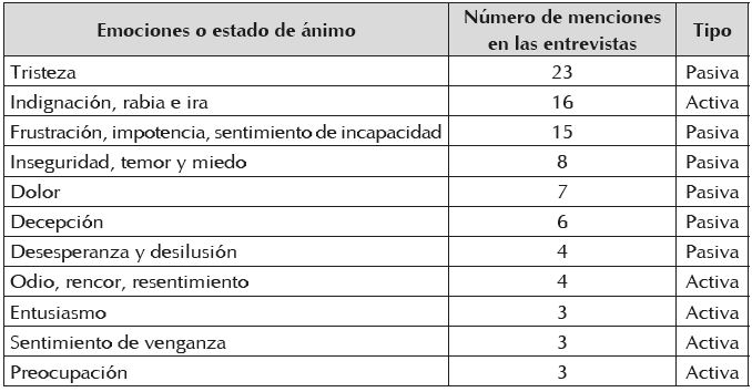 Vale la pena recordar que los movimientos sociales buscan modificar las reglas emocionales existentes tanto al interior como en el exterior del grupo, con el fin de promover estados emocionales favorables a la movilización social (Flam, 2005). Este esfuerzo resulta evidente cuando se observa que las dieciocho personas a quienes se interrogó acerca de la utilidad de las galerías de la memoria incluyeron en sus respuestas palabras como tomar conciencia, concientizar, reaccionar, darse cuenta de, informar, conocer, cambiar, reflexionar, sensibilizar; y en general todos opinaron que es un ejercicio útil y positivo. No obstante, cuando se preguntó a los entrevistados qué se requiere para que ellos u otras personas se vincularan al movimiento, solo tres entre diecinueve personas se mostraron dispuestos a hacerlo. Esto tal vez esté relacionado con el desbalance existente entre las emociones mencionadas por los entrevistados, pues como se observa en el Cuadro 4, son más comunes emociones pasivas como la impotencia y la tristeza que otras más activas y favorables a la movilización social como la ira o el entusiasmo.